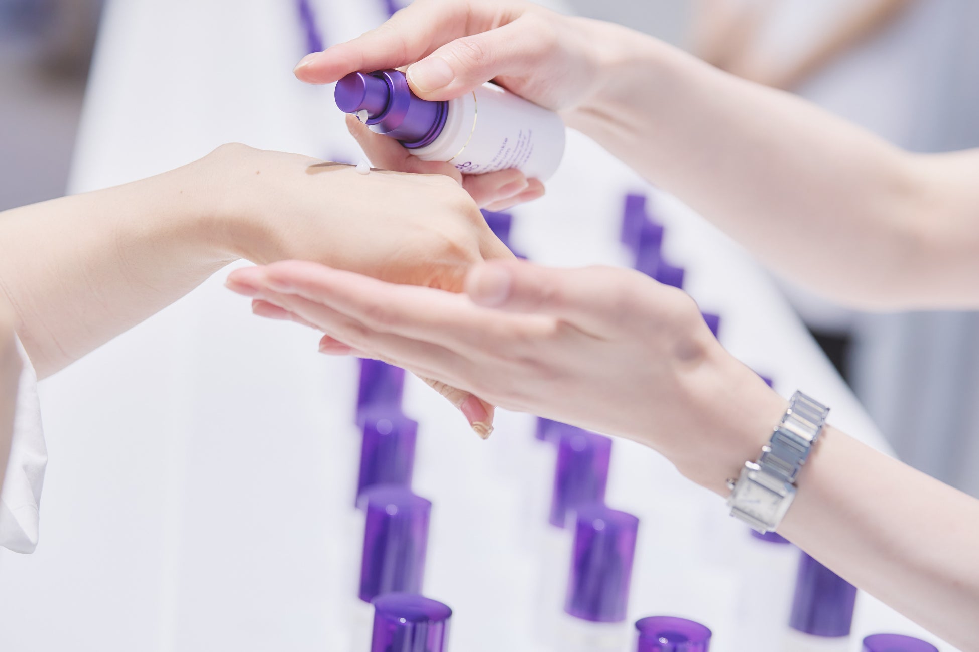 高温加圧滅菌処理を施すための特殊なボトルになっており、開栓体験をしながら、実際にお手元で製品もお試しいただきました。水溶性プラセンタエキス*1原液の「高濃度*2」という特徴に、「ベタベタするのでは?」「浸透しづらい?」という疑問を持たれる方もいらっしゃいますが、実際に使っていただくことで、「サラっとした使い心地」や「全然ベタつかない」「浸透*3の速さ」といった、使いやすさを感じていただけたかと思います。