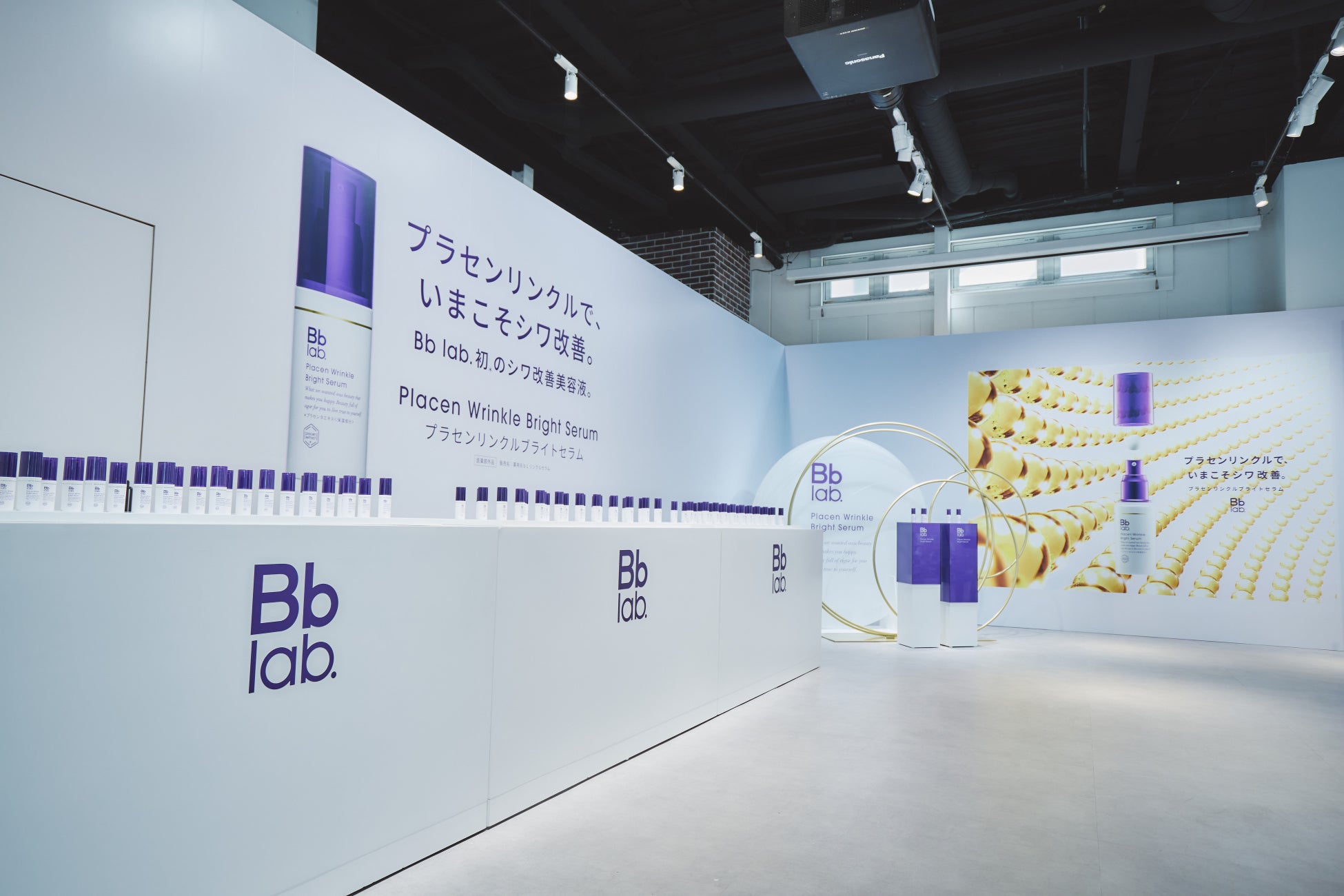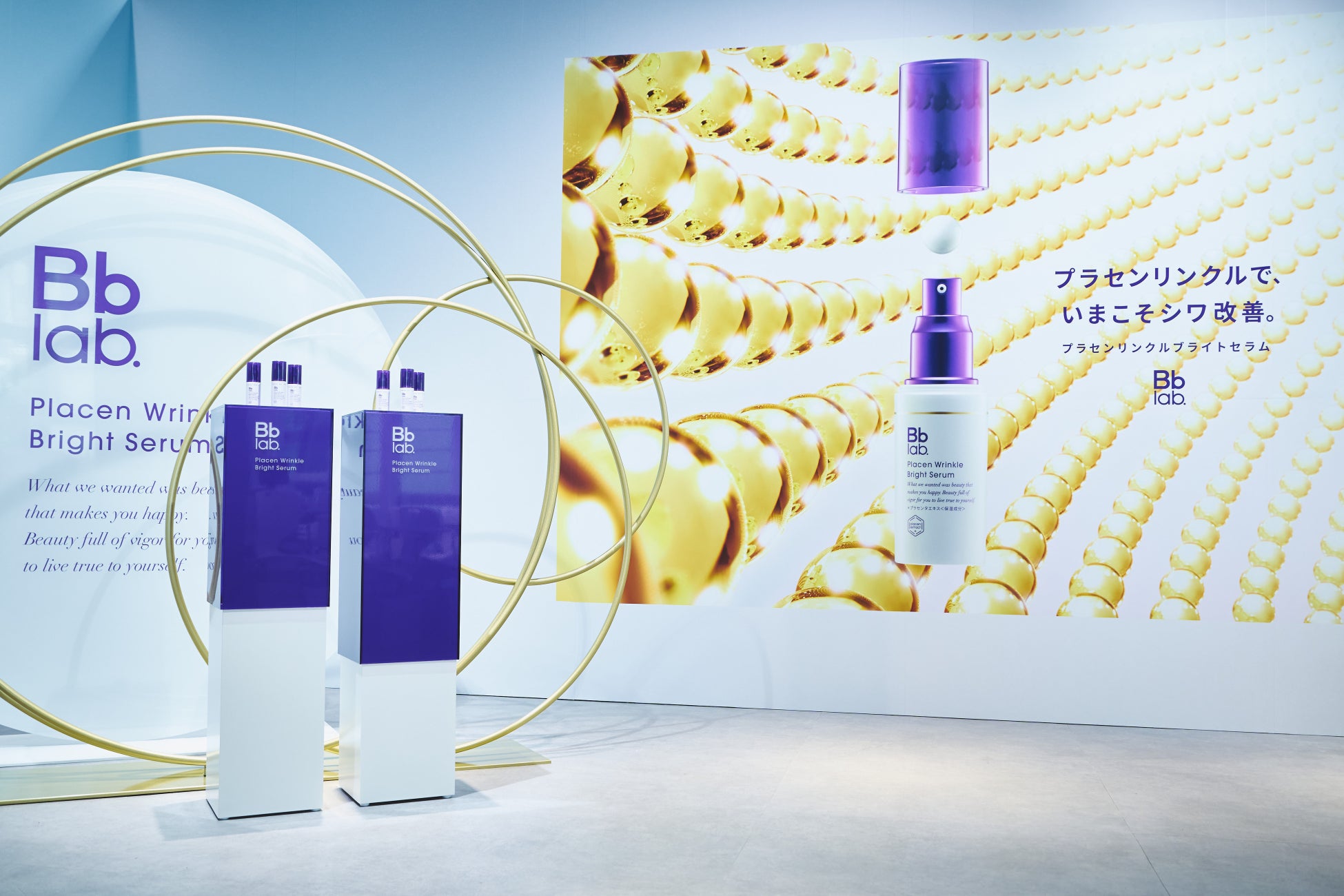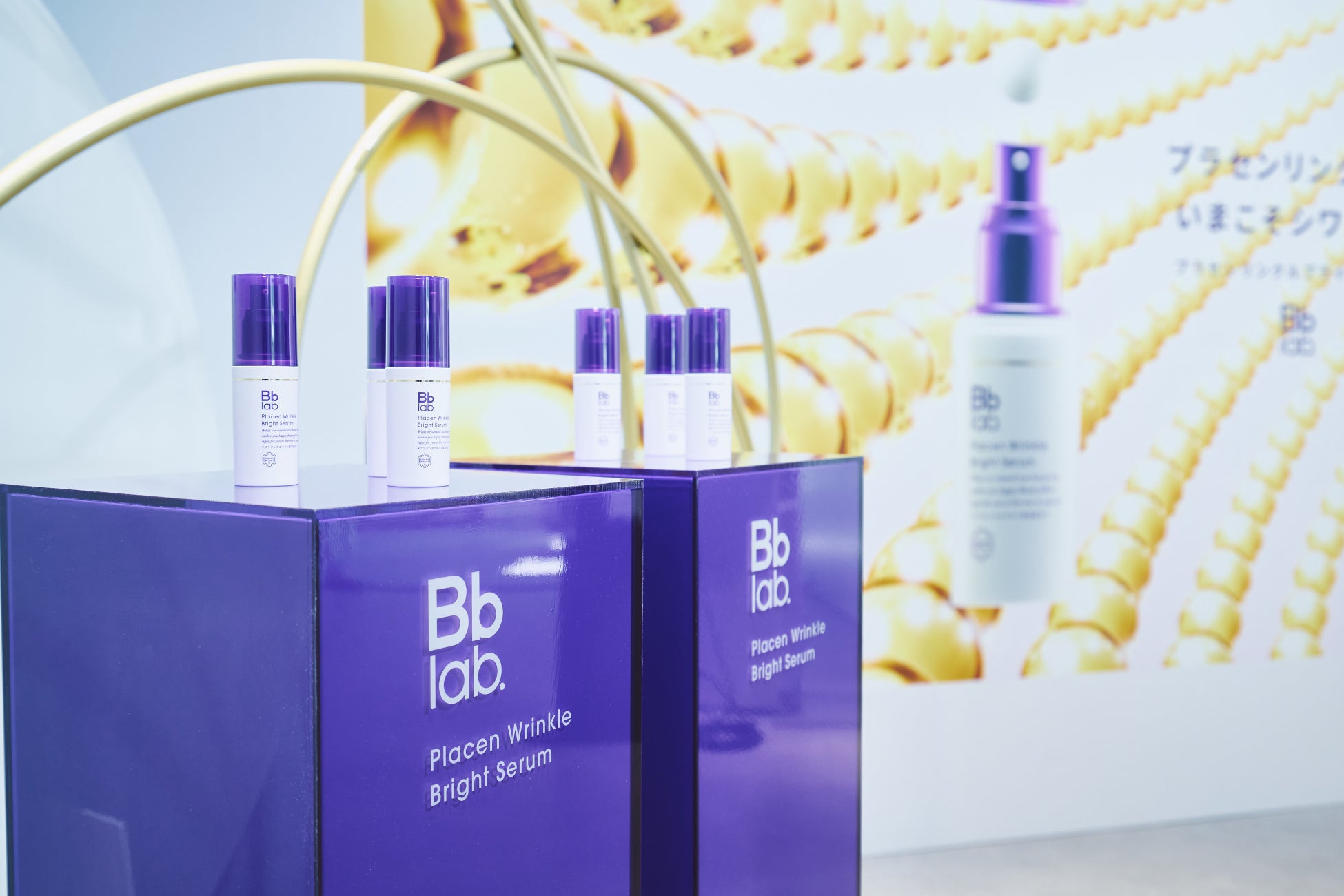 メインビジュアルは、プラセンタ*1原液のパイオニアであるBb lab.だからこその組み合わせ「プラセンタ*1×Wの有効成分*6」で、ハリと弾力、そしてみずみずしさといった、新製品のパワーをデザインテーマとしています。その隣にはブランドカラーである「Vital Violet」「Clean White」「Happiness Gold」を基調としたフォトスペースも設置。多くの方が撮影されておりました。