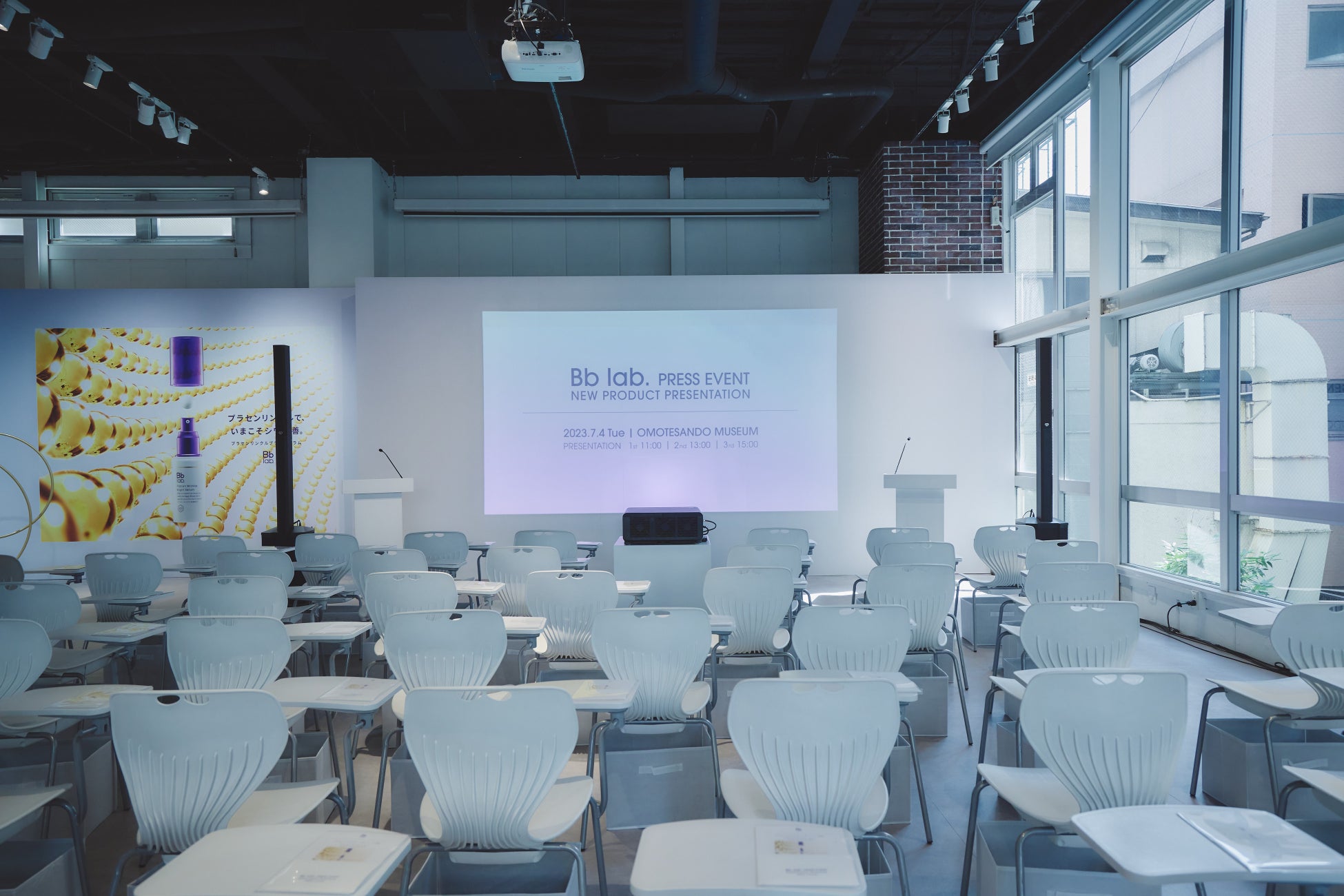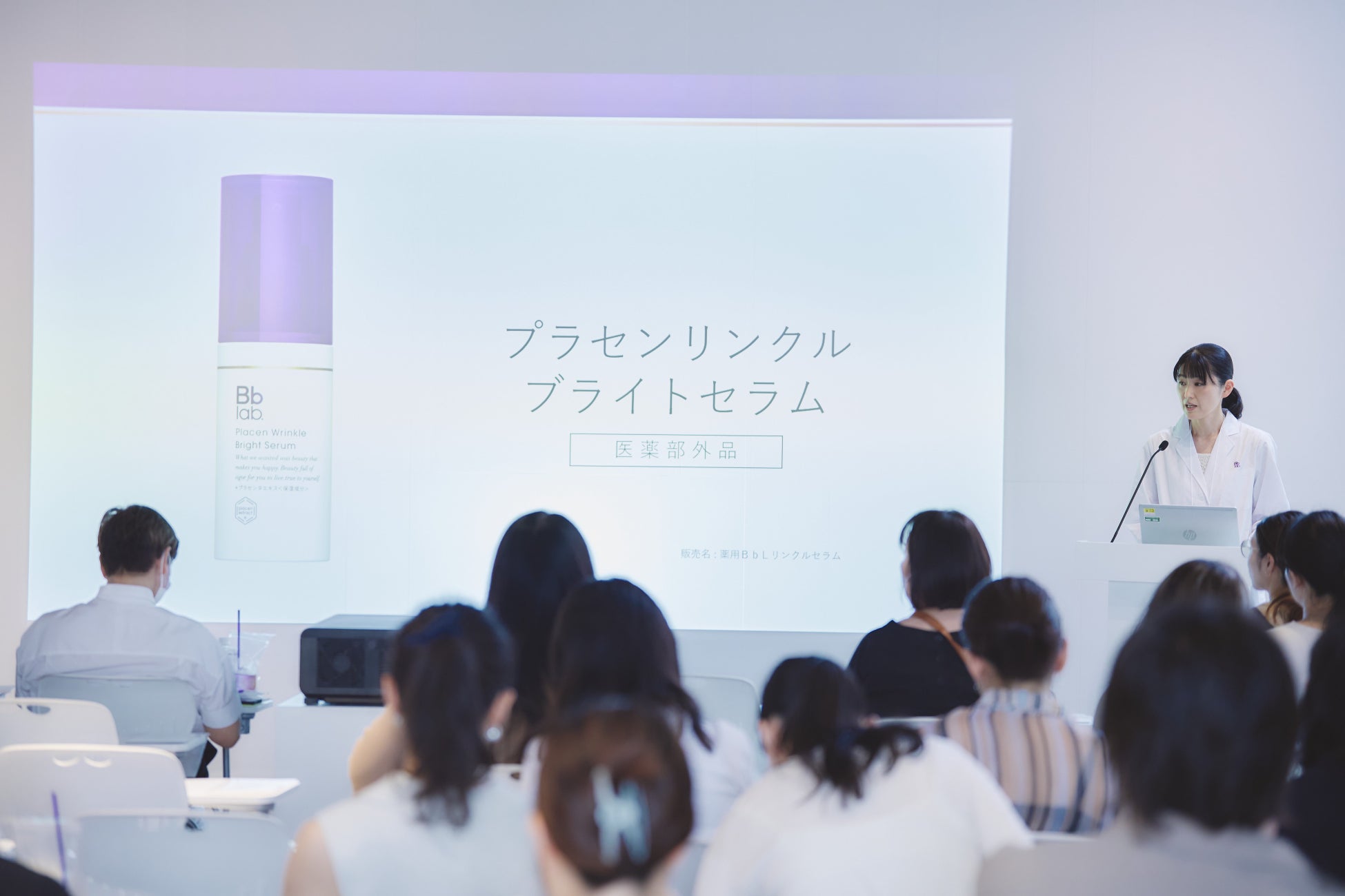 今回の発表会ではBb lab.ブランド設立当初から構想を練ってきた、ブランド初*となる医薬部外品のシワ改善美容液「プラセンリンクルブライトセラム」をより深く知っていただくため、製品展示ブースに加え、プレゼンテーションも実施いたしました。代表取締役社長 松﨑 まゆみの挨拶から始まり、ブランドについて、そして、製品の特徴や開発背景を、ブランドマネージャー、企画開発部担当者より、直接皆さまにお伝えいたしました。
