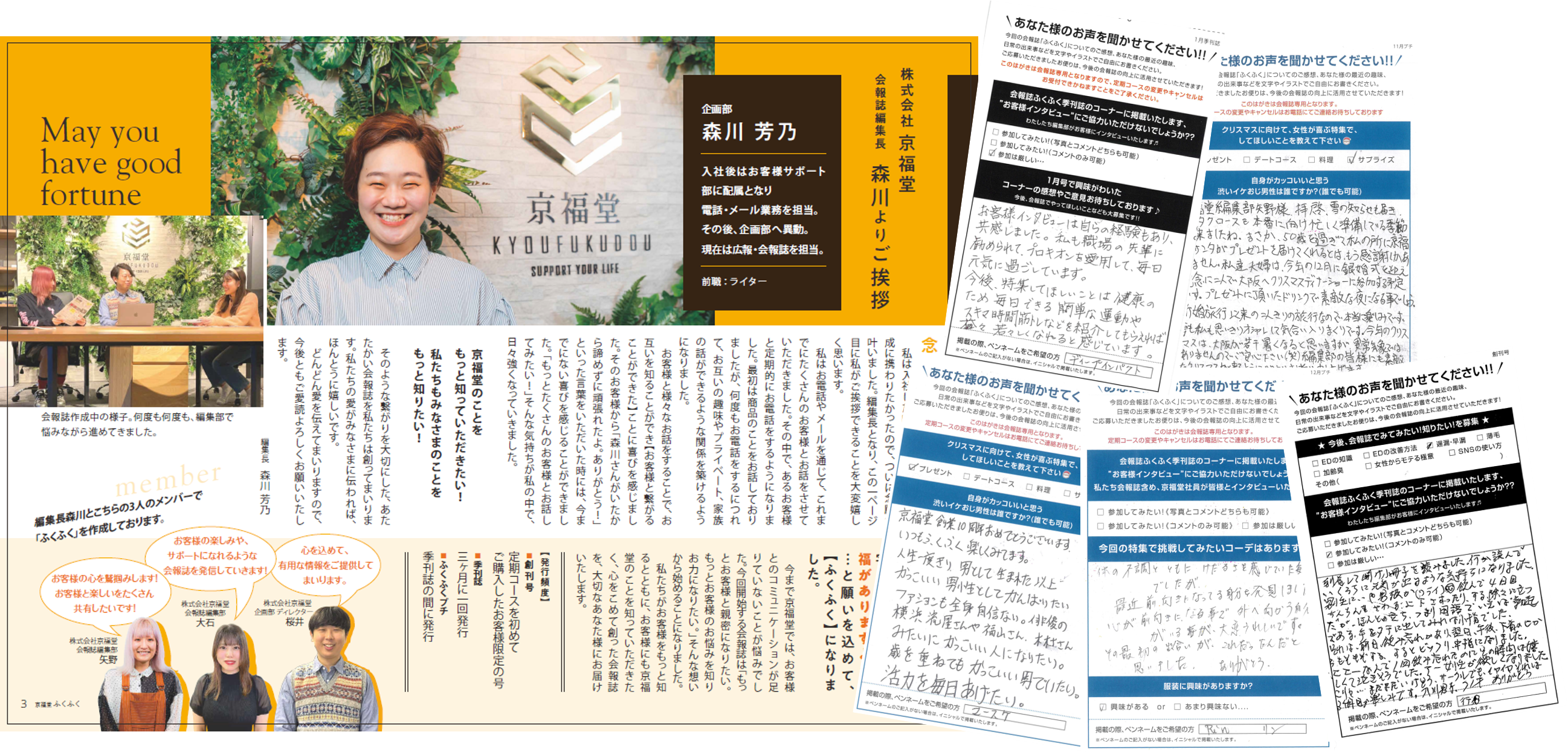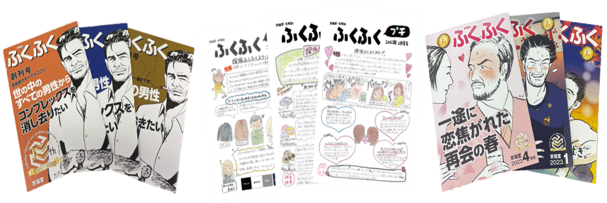 「会報誌ふくふく」は、京福堂商品を購入しているお客様に商品と一緒に同梱する冊子やチラシです。創刊号、プチ、季刊誌の3種類あります。