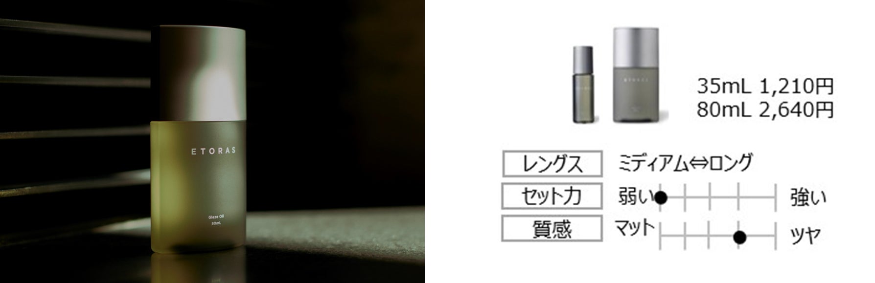 そのためETORASは従来※とは異なる「スキンケア発想」の美容成分で、表面的な油分に頼らず髪の内側から潤いを感じるようなヘアデザインを叶えて理想のデザイン再現性を高めました。