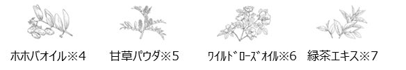 ※4ホホバ種子油(毛髪補修)、※5グリチルリチン酸2K(毛髪保護)オイル以外の全製品に配合、※6カニナバラ果実油(毛髪補修)、※7チャ葉エキス(芳香・毛髪保護)オイル以外の全製品に配合、※8アプリコット核油ポリグリセリル-6エステルズ(毛髪保護)オイル以外の全製品に配合