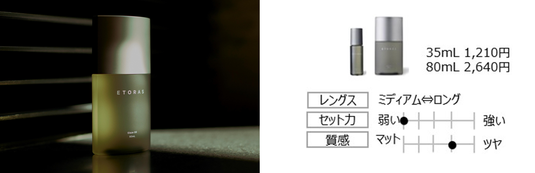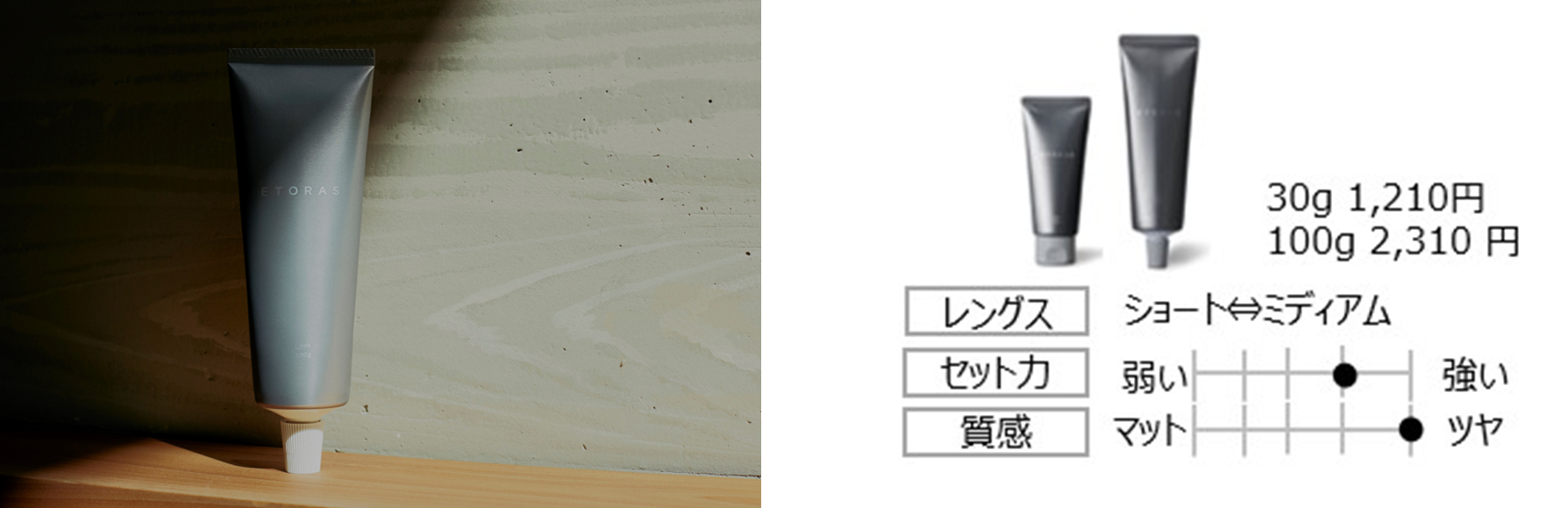 そのためETORASは従来※とは異なる「スキンケア発想」の美容成分で、表面的な油分に頼らず髪の内側から潤いを感じるようなヘアデザインを叶えて理想のデザイン再現性を高めました。