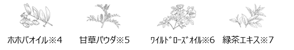 ※4ホホバ種子油(毛髪補修)、※5グリチルリチン酸2K(毛髪保護)オイル以外の全製品に配合、※6カニナバラ果実油(毛髪補修)、※7チャ葉エキス(芳香・毛髪保護)オイル以外の全製品に配合、※8アプリコット核油ポリグリセリル-6エステルズ(毛髪保護)オイル以外の全製品に配合