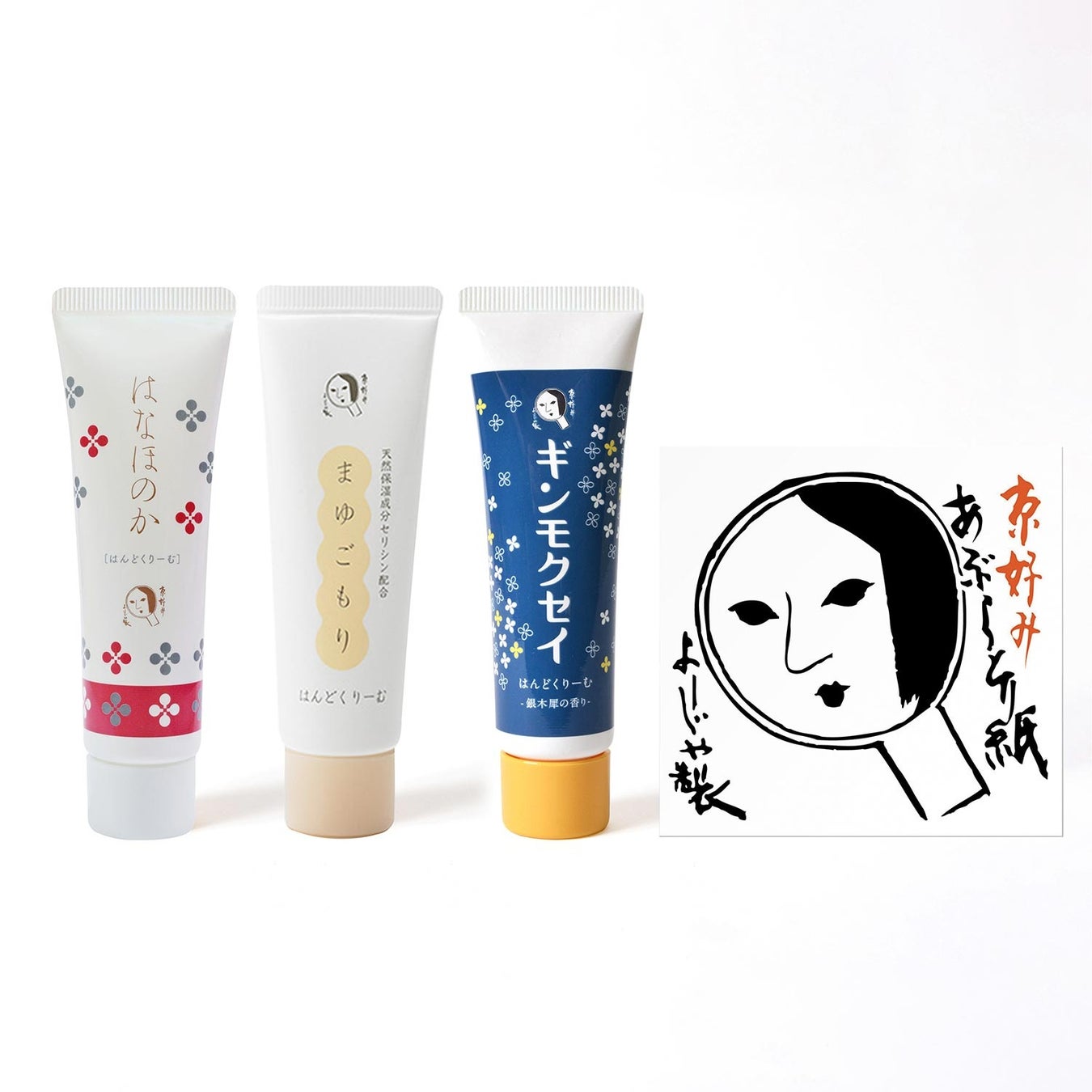 また、今回のオープンを記念して「よーじやルクアイーレOPEN記念セット」を200個限定で販売いたします。「あぶらとり紙」とよーじや人気のまゆごもりとはなほのかに、季節限定のギンモクセイのハンドクリームが入ったセット。ギンモクセイをイメージした可愛らしいステッカー(非売品)付きです。