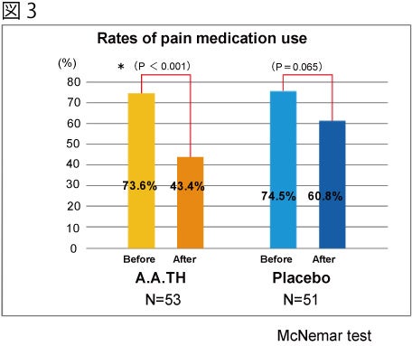 また、月経中の鎮痛薬の使用率が、両群共に介入後に低下したが、A.A.TH 群の方が減少率が22.7%高く、介入前後で有意差があった。(図3)