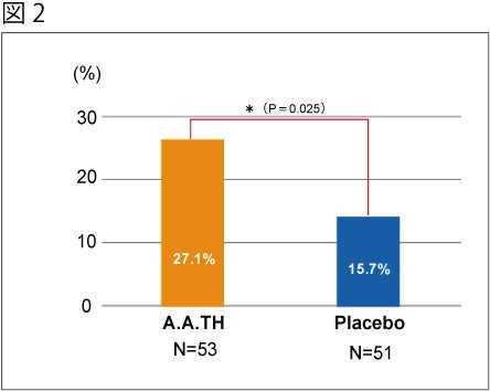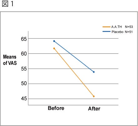 研究に参加した131名のうち104 名からアンケートに有効な回答があった。(A.A.TH 群N=53、プラセボ群N=51)VAS およびMDQ スコアは、両群の介入後に有意に低下(図1)したが、VAS の月経痛の減少率(図2)はA.A.TH 群は27.1% でありプラセボ群の15.7% に比してA.A.TH 群で11.4%高く、有意差があった。(.t 検定、*p=0.025)