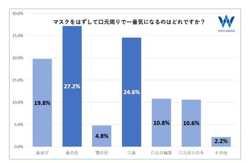「マスクを外して、口元周りで一番気になるのはどれですか」と聞いたところ、「歯の色」と回答した方が27.2%、ついで「口臭」と回答した方が24.6%に上りました。