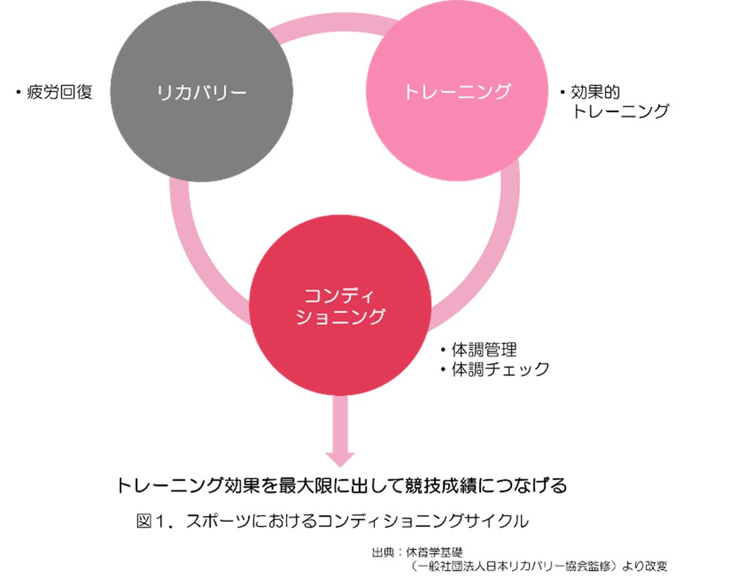 アスリートは身体的・精神的にストレスが多い環境下にあり、過剰なストレス下ではコンディションの低下をきたします。そのため、トレーニング、リカバリー、コンディショニングのサイクルを効果的に回すことがパフォーマンスアップにつながるといわれています(図1)。