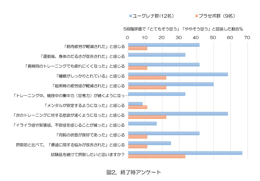 ・体感アンケートではユーグレナ群の40%以上の方が、「筋肉疲労軽減」「長時間トレーニングでも疲れにくくなったと感じる」「起床時の疲労感軽減」「次のトレーニングへの意欲を感じる」「胃腸の調子が良くなった」の項目で、「そう思う」との回答をし、プラセボ群に比べて、高い値を示しました。特に「睡眠がしっかりとれている」「継続摂取意向」ではユーグレナ群の60%以上の方が「そう思う」と回答をし、有意な結果が得られました(図2)。
