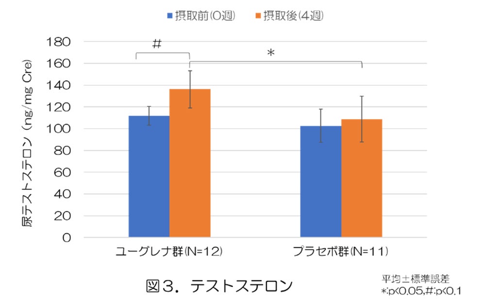 ・尿テストステロン*6において摂取後実測値でユーグレナ群の方が有意に高く、さらに摂取前後で高い傾向を示しました(図3)。