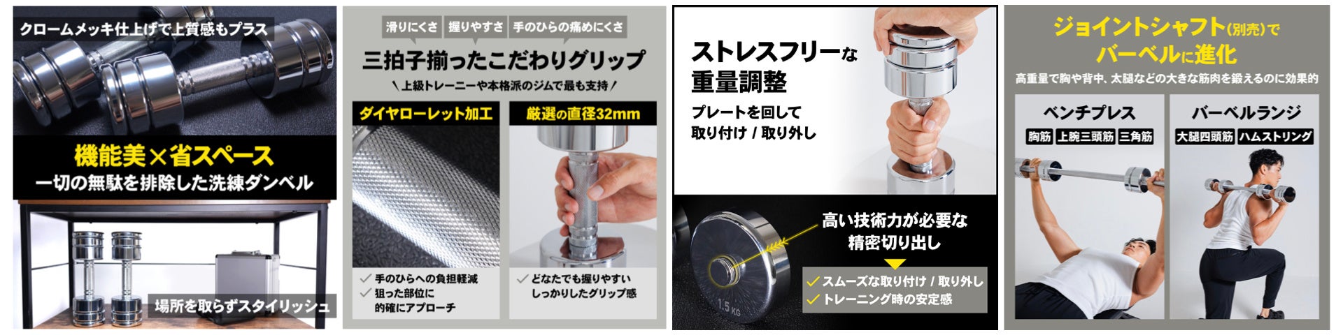 本製品が目指したのは、日々のトレーニングに対する士気が高まる【スタイリッシュさ】とトレーニング時の集中力&高揚感が持続する【使いやすさ】の両立。従来の可変式ダンベルは黒を基調に雄々しさを際立たせた無骨なデザインが多い中、本製品は機能美を追求し、極限までデザインの無駄を削ぎ落とすと共に、鏡のようにシルバーに輝くクロームメッキを施すことでコンパクトかつ上質感のある洗練デザインに仕上げました。場所を取らず、リビングやベッドルームに出したままでも部屋の雰囲気を損なわないため、思い立ったら即トレーニングに臨める環境を自宅で手に入れることができます。また、可変式ダンベルの肝である重量変更のしやすさはスムーズさに重点を置き、プレートを固定するネジ部分を高い技術力を要する精密切り出しで造形することで取り付け / 取り外し時のプレートの滑りの良さとタフなトレーニング中での落下の心配がない高い安定感を実現しました。