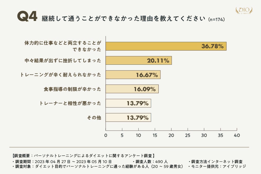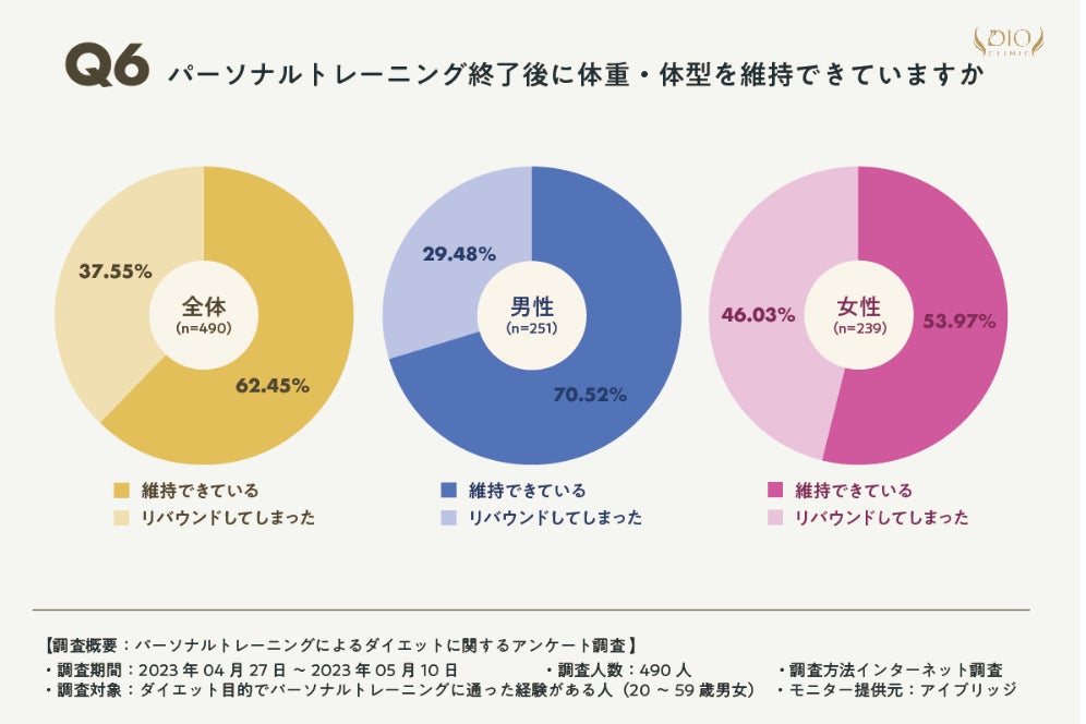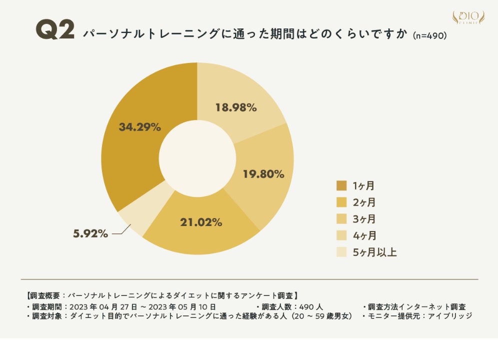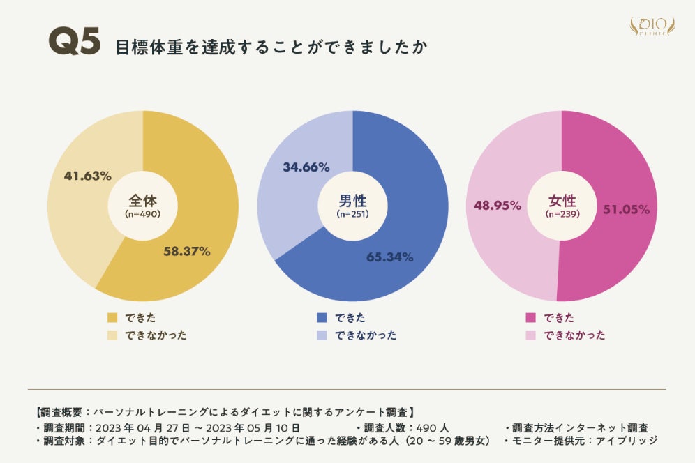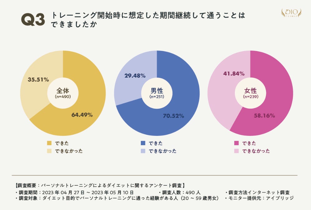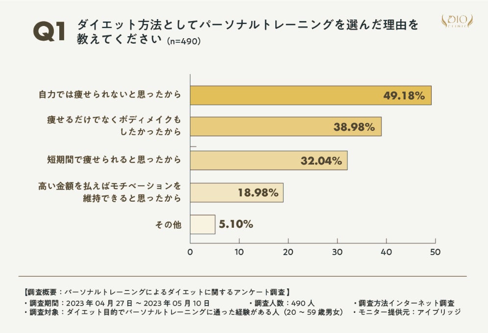 そこで医療痩身専門クリニックであるディオクリニックが、「ダイエットのために1ヶ月間以上パーソナルトレーニングに通ったことがある20~59歳の男女490名」を対象に、アンケート調査を実施しました。