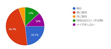 すなわち、69.4%の方は週に数回以上、つまり習慣的にメイクを行っていることがわかります。