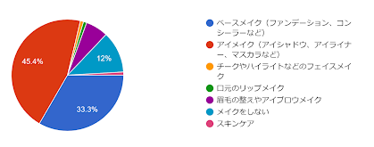 調査の結果、45.4%の「アイメイク」が最も多く、続いて33.3%の「ベースメイク」が多いことが明らかになりました。