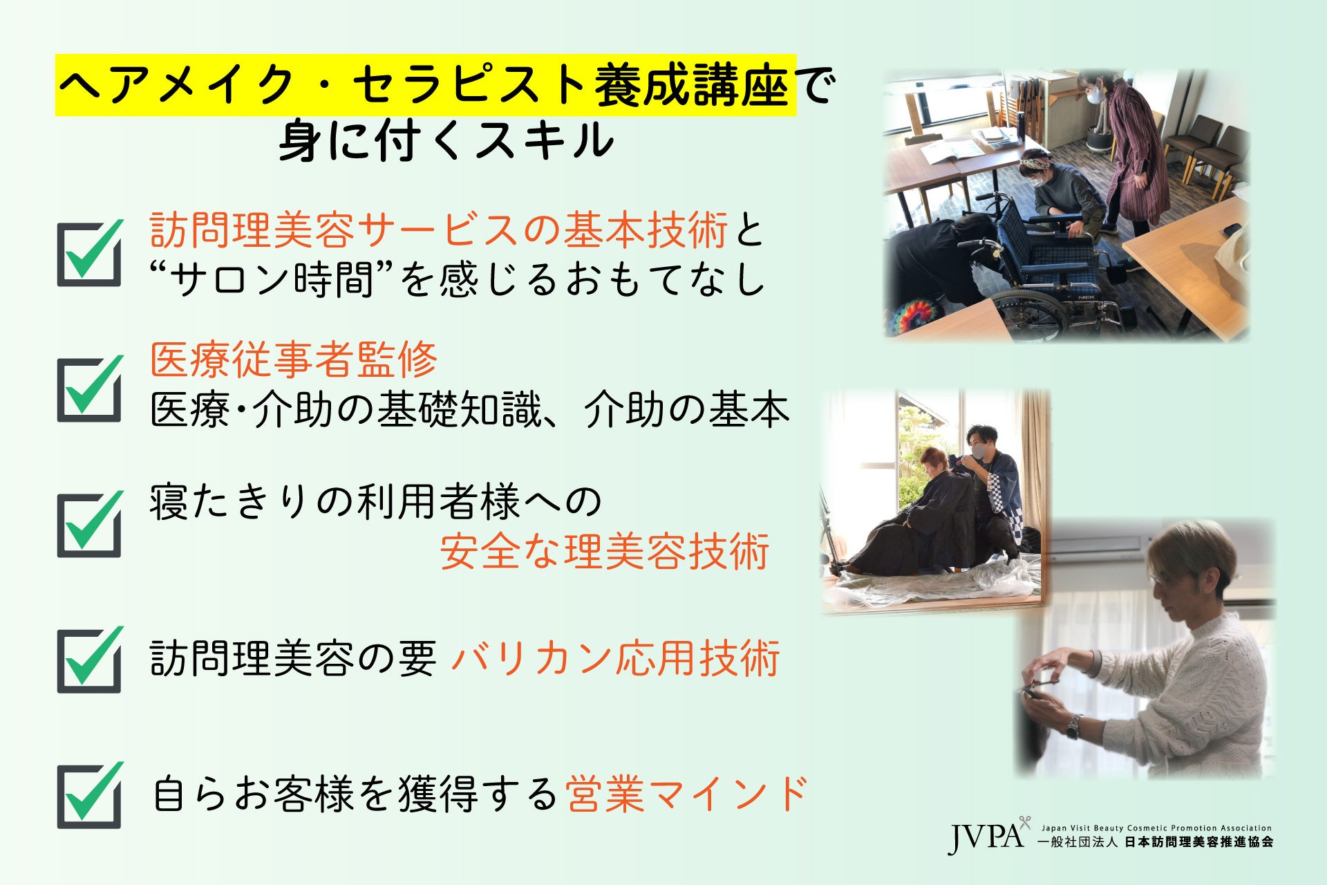 「ヘアメイク・セラピスト(訪問福祉理美容師)養成講座」で、訪問理美容に関する技能の取得、医療従事者監修の医療・介助の基礎知識、介助の基本、訪問理美容の営業マインドといった必須スキルを、短期1日で学んでいただきます。