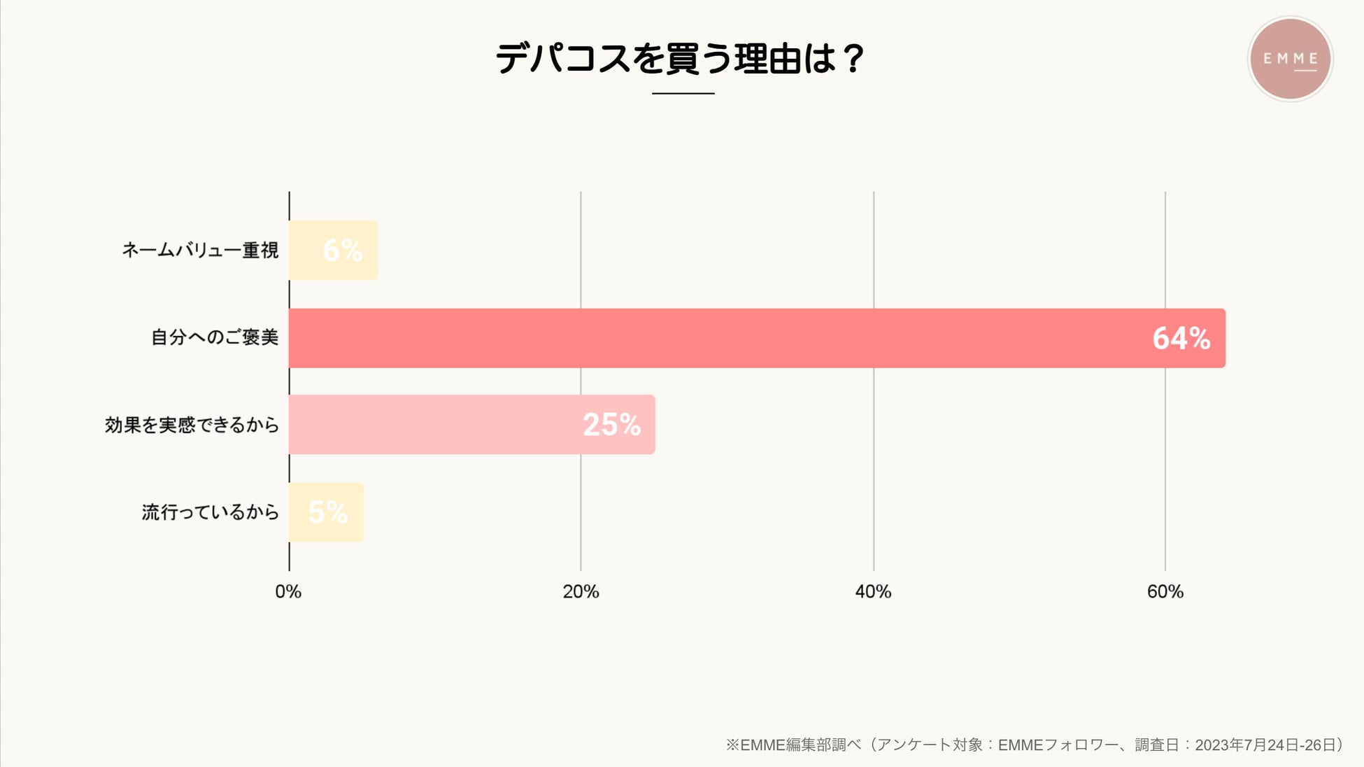 美容関心層であるEMMEのフォロワーに対して、使っている化粧品はデパコスなのかプチプラコスメなのか調査を行いました。