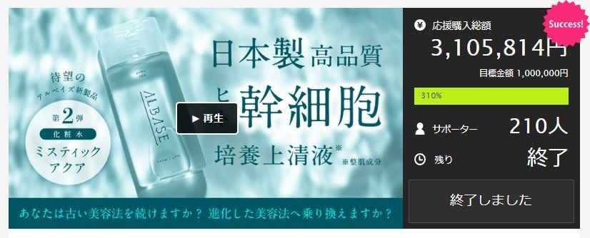 ■第一弾製品アルベイズ・リベレイトローションのクラウドファンディングは750万円を超える支援を受け大成功