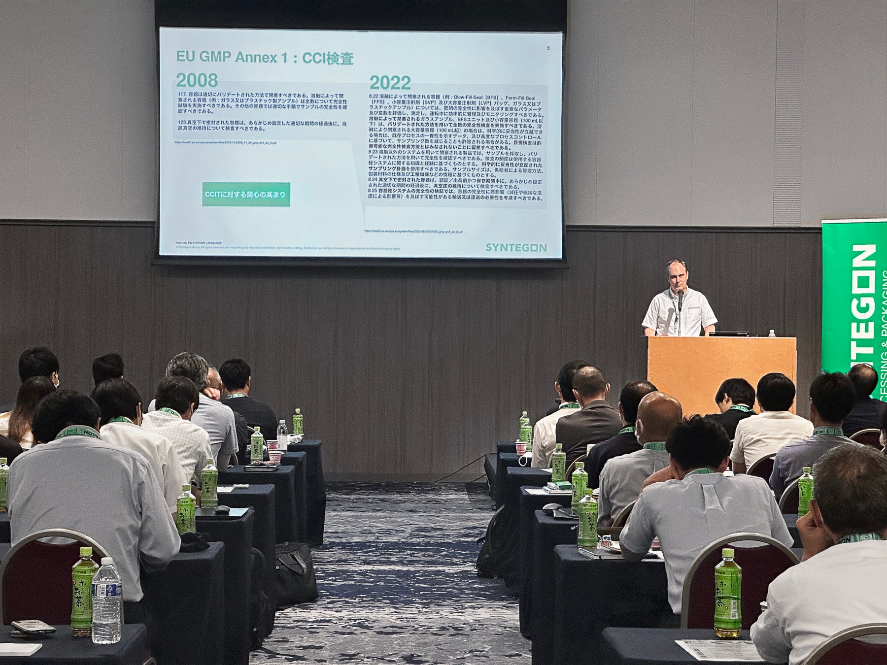 そして「容器完全性試験(CCIT)の先進的取り組み 」と題した講演では、日本でも近年関心の高まるCCITについて規制面や検査手法などを概括。高電圧検知モジュールやヘッドスペース分析を採用した装置での具体的な検査や測定方法や実例についても説明いたしました。