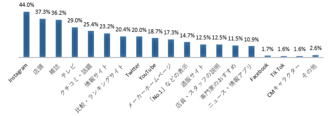 トレンドについては、「積極的に取り入れている」5.15.1%、「少し取り入れている」22.522.5%、「意識しているがなかなか取り入れられていない」32.332.3%という結果に。子育てや家事、仕事と忙しい毎日の中でも、トレンドを意識してメイクを楽しみたいと思っている人は約6 割いるものの、3 割強の人が、なかなかうまく取り入れられていないのが実情のようです。美容についての情報源は下記グラフの通り(複数回答)。世代別にみると、SNS の活用度は20 代~30 代で高く、ただほぼどの世代でも「店頭」と回答した人が3 割以上となっており、リアルに商品を見て、試して、検討することを重要視する人が一定数いることが分かりました。