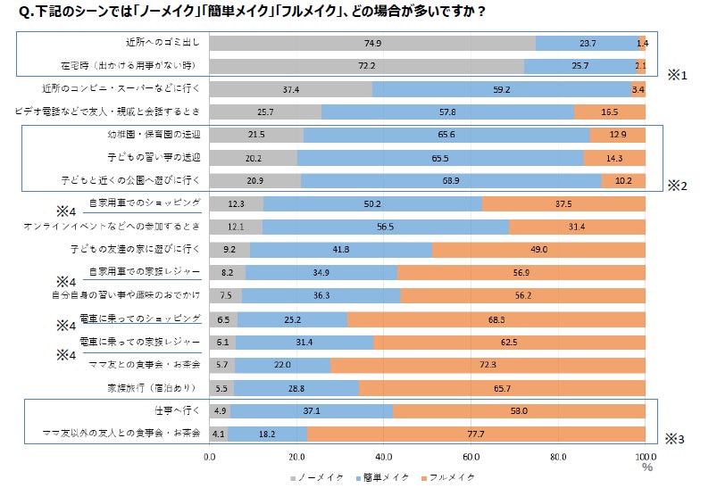 子ども中心のシーンではノーメイク2 割、簡単メイク6 割強、フルメイク1 割強(※2 )