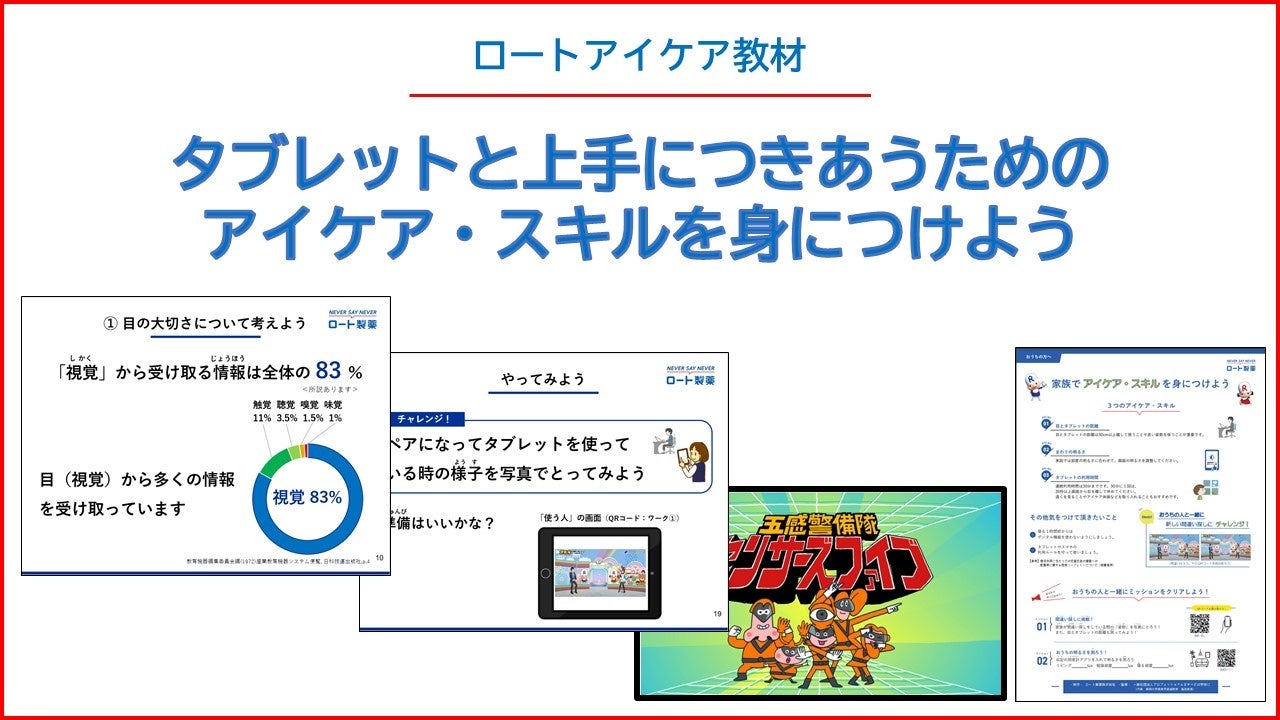 ①タブレットと上手に付き合い目の健康を学ぶ「ロートアイケア教材」(小学教育関係者向け)