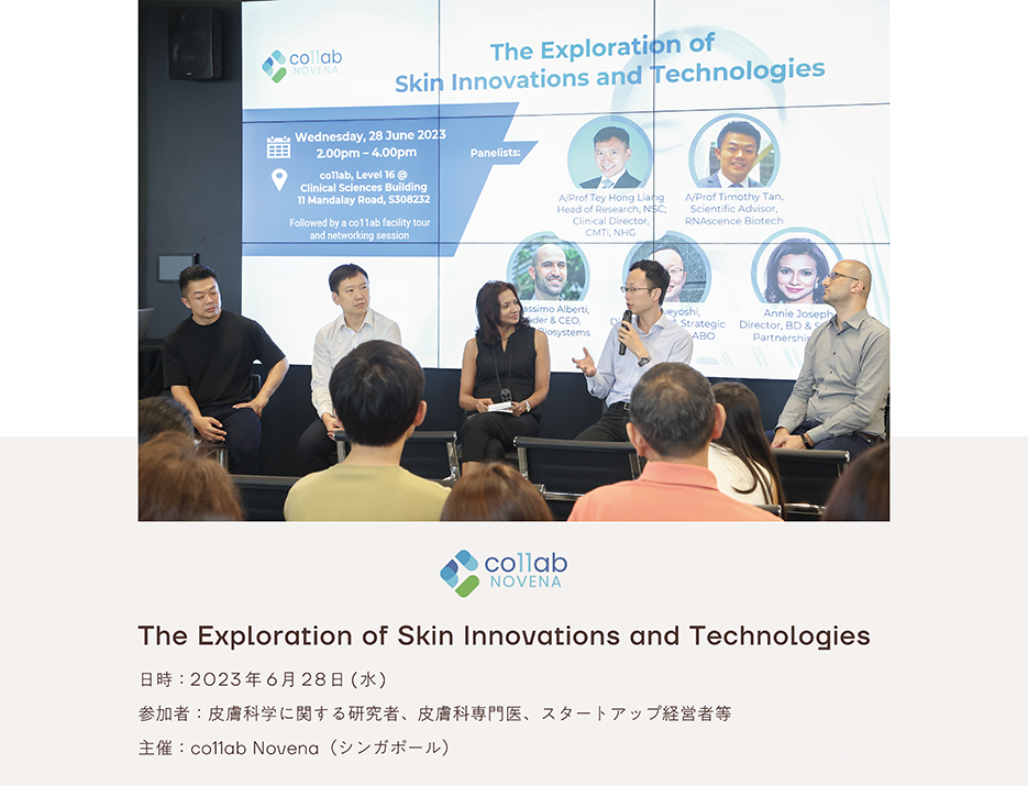 co11ab Novena の主催者であるシンガポール南洋理工大学、科学技術研究庁(A*STAR)、ナショナル・ヘルスケア・グループは、シンガポール皮膚科学研究所(SRIS:Skin Research Institute of Singapore)及びシンガポール国立皮膚センターと連携し、皮膚科学分野で世界トップレベルの研究を行っています。今回のセミナーは、シンガポール国立皮膚センター、シンガポール皮膚科学研究所及び皮膚科学領域において革新的な技術を有するスタートアップのパネリストが登壇し、最先端の皮膚科学に関するトピックについて発表・ディスカッションを行う目的で開催されました。