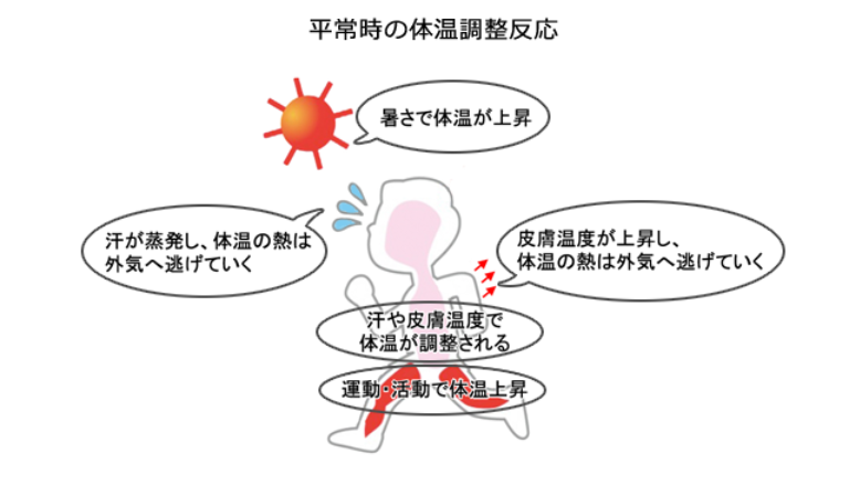 人間の体は本来、平常時は体温が上がっても汗や皮膚温度が上昇することで体温が外へ逃げる仕組みとなっており、体温調節が自然と行われます。