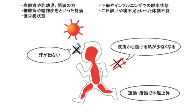 しかし、加齢とともに体温調節機能は低下していきます。普段運動をしない人は発汗機能が低下しており、さらに肥満になることで熱が体にこもりやすくなるため、熱中症を引き起こす要因になると言われています。