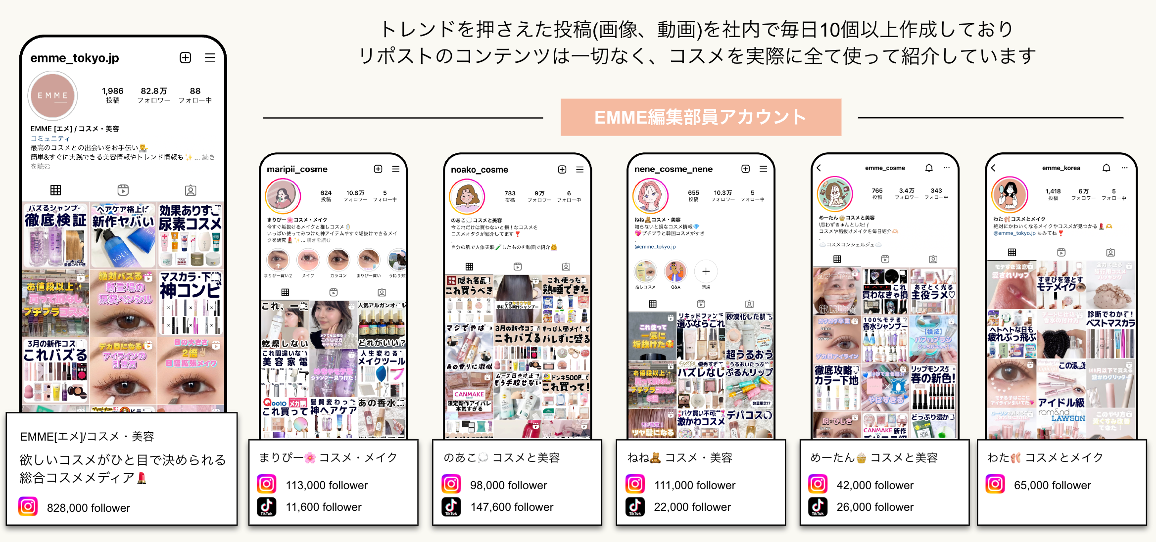 またEMMEの編集部員たちの各々のアカウントもあり、オリジナルコンテンツを発信しています。