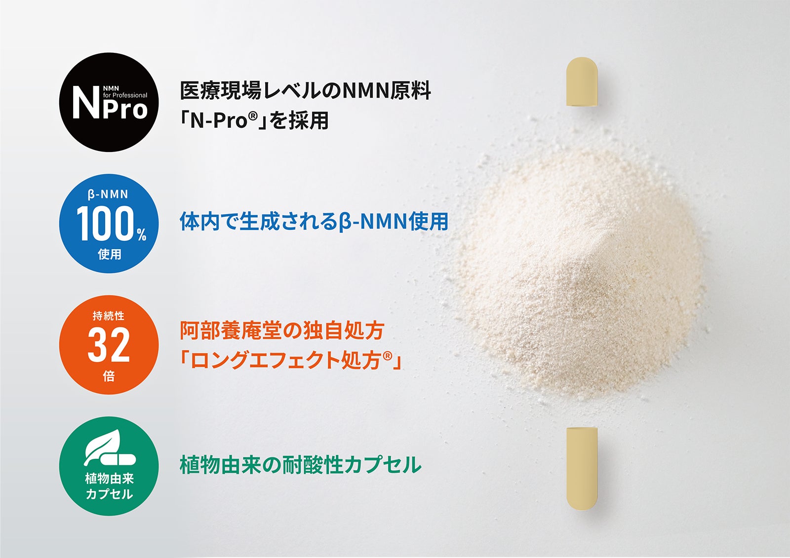 国産NMN配合サプリメント、日本初(※1)リポソーム化NMN(※2)配合コスメを展開する株式会社 阿部養庵堂薬品(東京都足立区、代表取締役:阿部朋孝)は、本日2023年8月1日(火)より、配合成分の質・量ともにこだわり抜き、医療機関でも採用される安全性の高い自社製造NMN原料・N-Pro®︎を用いたNMNサプリメント4種を発売いたします。