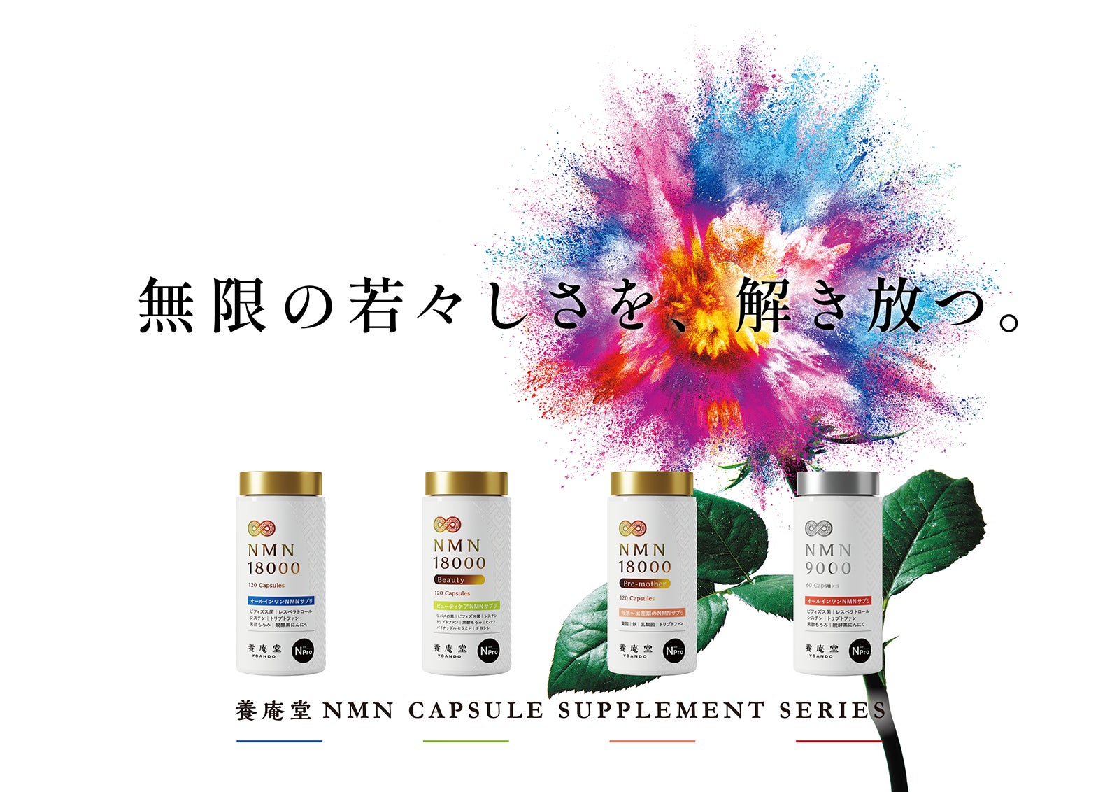 『養庵堂 NMN 18000』『養庵堂 NMN 18000 Beauty』『養庵堂 NMN 18000 Pre-mother』『養庵堂 NMN 9000』は、NMNの研究が発展するにつれて“高品質NMNをより多く摂取したい”といったニーズが高まる中、皆様に体感をより得ていただき、目的に沿った若々しさや健康寿命をサポートしたいという想いから開発に着手した、カプセルタイプのサプリメントです。
