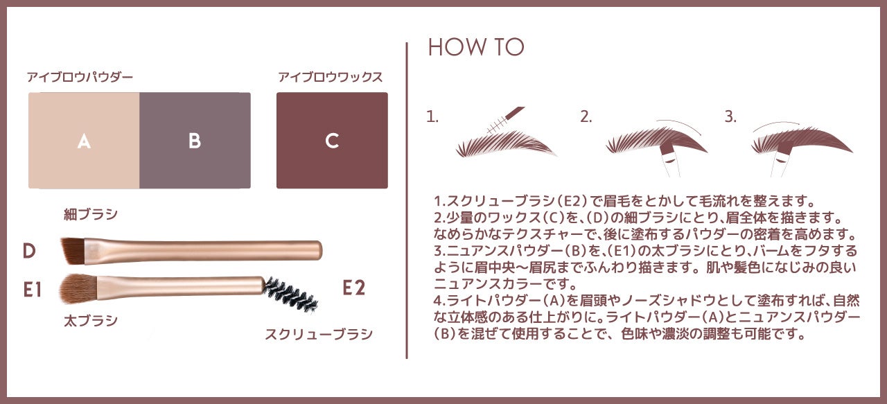 ③ ニュアンスパウダー(B)を(E1)の太ブラシにとり、バームをフタするように眉中央~眉尻までふんわり描きます。肌や髪色になじみの良いニュアンスカラーです。