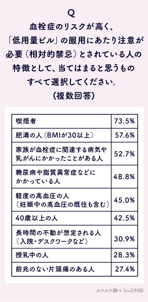 Q. 血栓症のリスクが高く、「低用量ピル」の服用にあたり注意が必要(相対的禁忌)とされている人の特徴として、当てはまると思うものすべて選択してください。(複数回答)