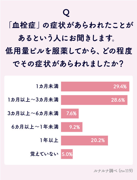 Q. 「血栓症」の症状があらわれたことがあるという人にお聞きします。低用量ピルを服薬してから、どの程度でその症状があらわれましたか?