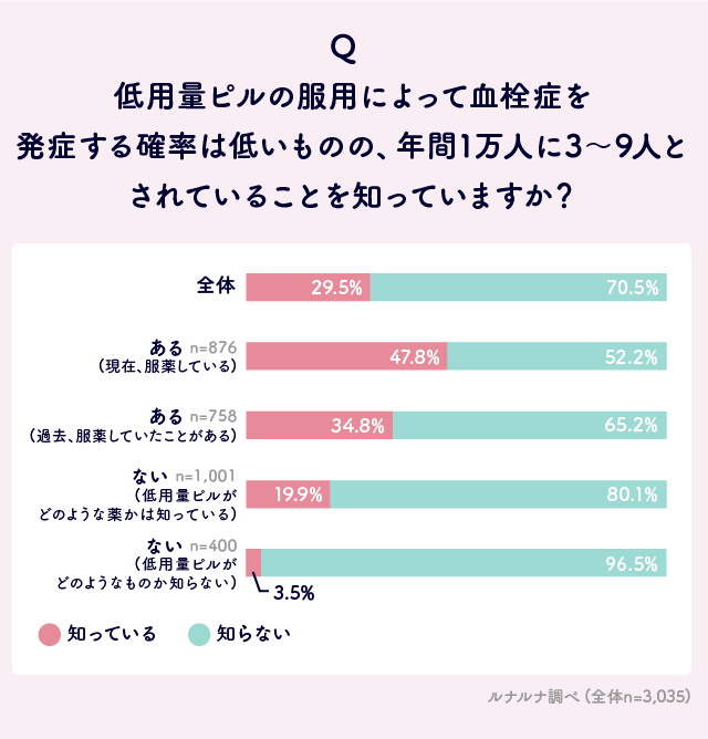 さらに、低用量ピルの服用によって血栓症を発症する確率については、「知っている」29.5%、「知らない」70.5%となり、具体的な発症確率まで知っている人は約3割にとどまることが分かりました。