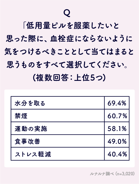 Q. 低用量ピルを服薬したいと思った際に、血栓症にならないように気をつけるべきこととして当てはまると思うものをすべて選択してください。(複数回答)