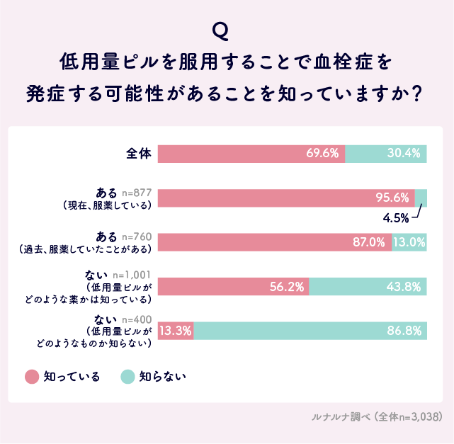 つぎに、低用量ピルの服用により血栓症を発症する可能性があることを知っているかを聞いてみたところ、全体では「知っている」69.6%、「知らない」30.4%となり、約7割が知っているという結果になりました。