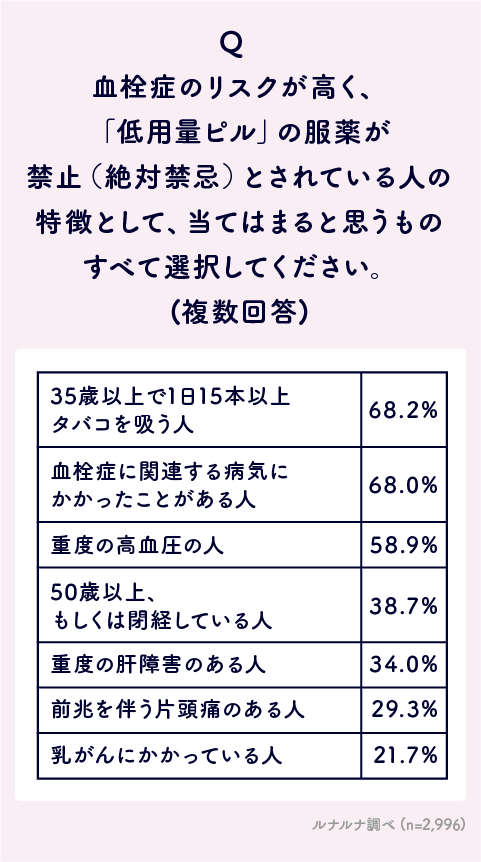 Q. 血栓症のリスクが高く、「低用量ピル」の服薬が禁止(絶対禁忌)とされている人の特徴として、当てはまると思うものすべて選択してください。(複数回答)