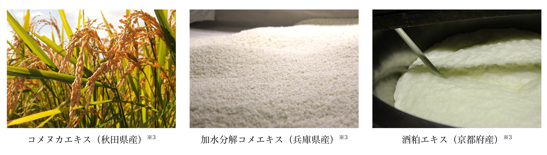 秋田県産のコメヌカエキス、兵庫県産の加水分解コメエキス、京都府産の酒粕エキスを配合し、炊き立てのお米のようにふっくらみずみずしくツヤのある肌に整えます。