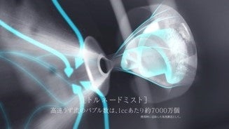 吐水する際に水流の内部を空洞にした直進性の高い吐水。ウルトラファインバブル発生機構に加え、リング状に吐水された吐水の空洞部でも気流を巻き込むことによって、より多くのウルトラファインバブルを生成します。リング状にする事によって、水流の外流が薄膜状態となったことから物と衝突した瞬間に隙間や凹凸内に入り込むことで、今まで及ばなかった部分にまで水流が届きます。衝突感は少ないながら、すき間への洗浄に適していることから、歯間洗浄などに威力を発揮します。