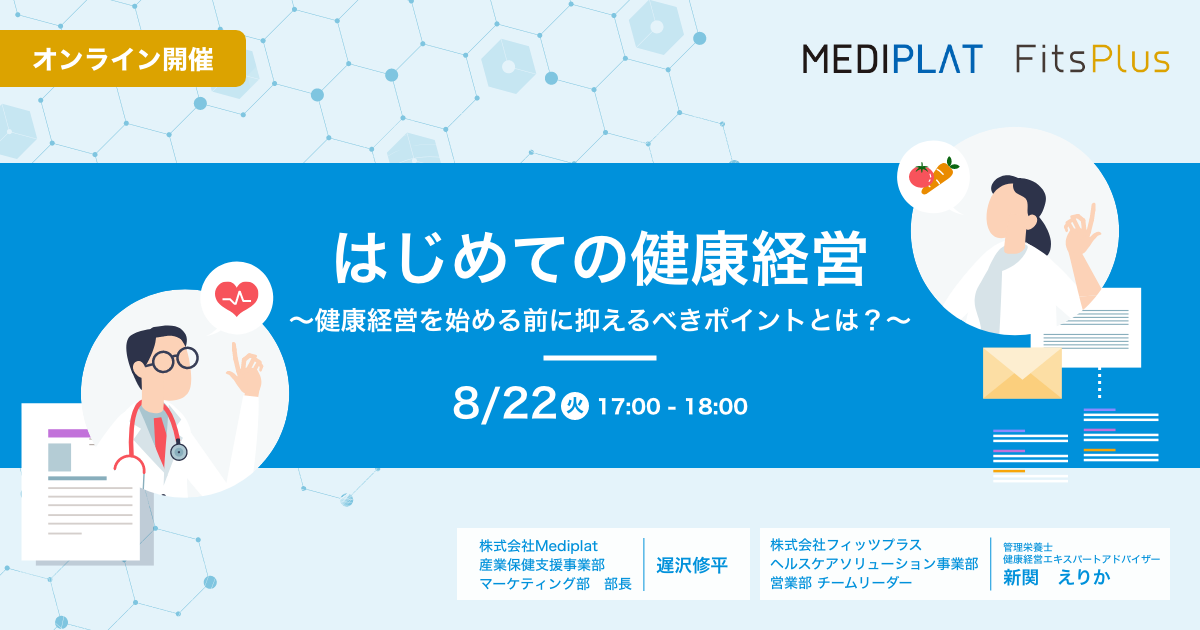 この度、健康経営をサポートしてきた両社にて、健康経営に関心のある経営者、人事・労務担当者を対象として無料オンラインセミナーを開催することといたしました。セミナーには、Mediplatで多くの企業の産業保健領域を中心とした健康課題をサポートしてきた遅沢、健康経営エキスパートアドバイザーの資格を持つフィッツプラスの新関が登壇し企業の抱える課題やその解決策を具体的な事例を交えて解説いたします。