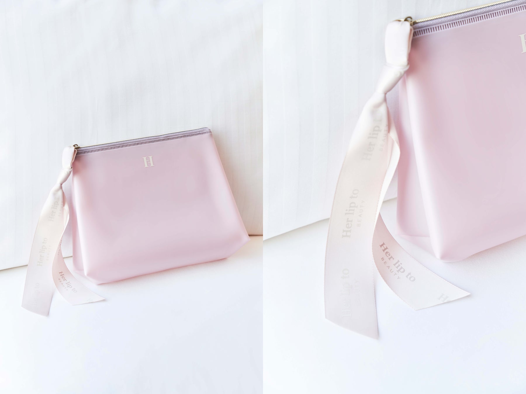 ブランドロゴが施されたエレガントなサテンリボンが目を惹く本セット限定のオリジナルポーチは、自立するマチ付きタイプで見た目以上に大容量なところもポイント。Her lip to BEAUTYのイメージカラーでもあるローズカラーのボディにシャンパンゴールドのジップを組み合わせました。