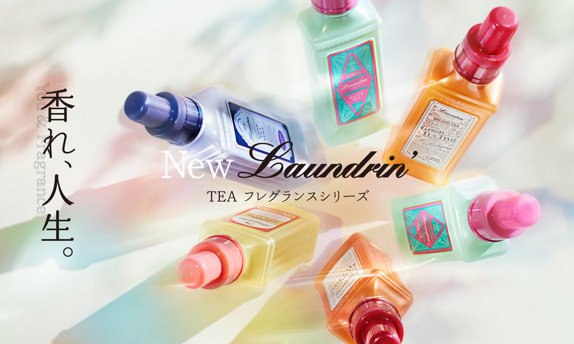 ランドリンのブランドメッセージ「You & Fragrance」に加え、フレグランスブランドとしての存在価値を伝える「香れ、人生。」というキャンペーンコピーを開発しました。ランドリンがもつ香りブランドの「ポジティブな世界観」を加味し、ティーフレグランス4種を花弁のように見立てて撮影しました。