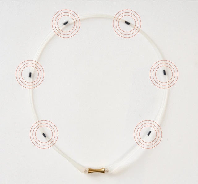 研究を重ねた独自製法により、直径2.5mmの細いシリコンの中に最大200mT(ミリテスラ)の永久磁石を6個配置。スタイリッシュなデザインでありながら、肩こり・首こりのつらい悩みをゆるめ、血行を促進します。