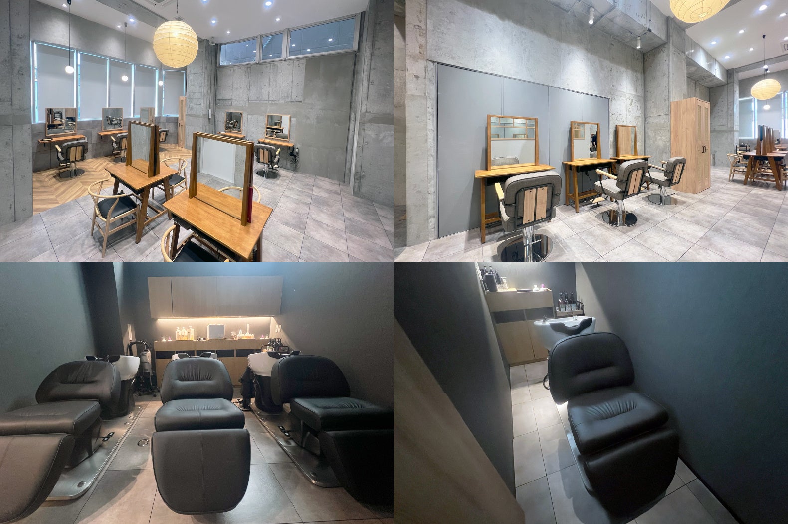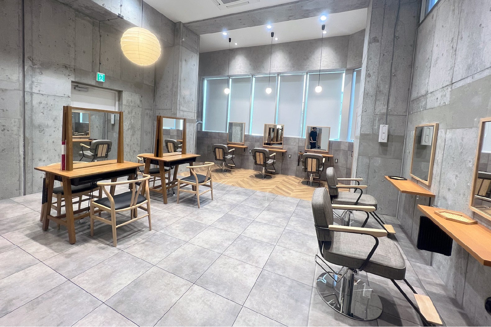└新築ビルの躯体を活かしながら、日本らしい木調や織物を配置して落ち着きを演出。「Japandi」を意識した本能的にリラックスできる、ヘアサロンが苦手な方でも何度でも足を運びたくなる落ち着いた空間です。