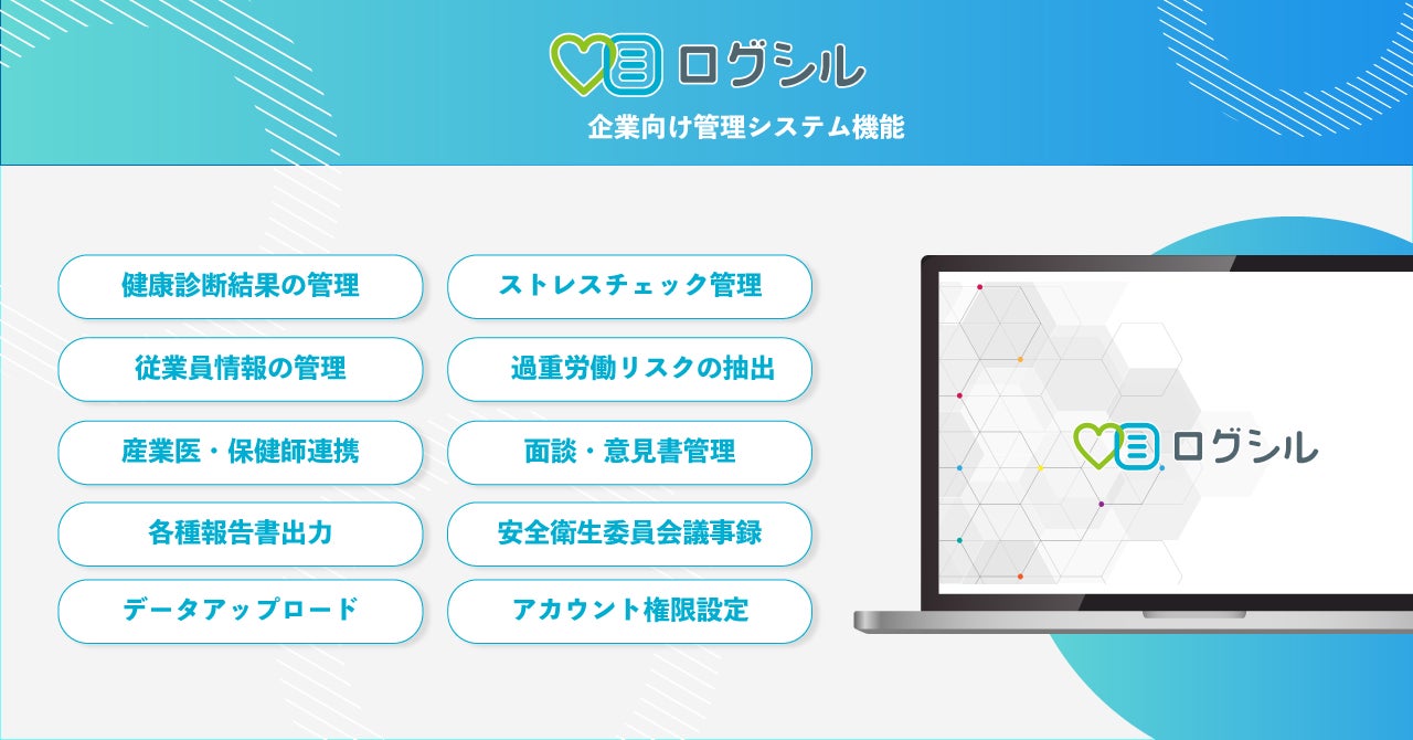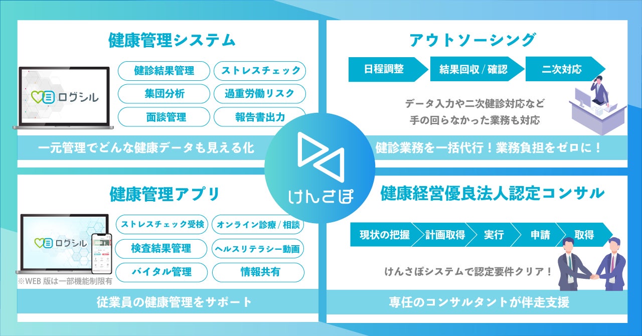 「けんさぽ」は健康管理システム「ログシル」と健診予約や健診データ入力などのアナログ作業のアウトソーシングを業界最安値水準である月額100円/人~で提供することで、企業の健康管理業務の負担を大幅に軽減する企業向け健康管理サービスです。