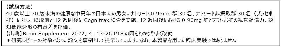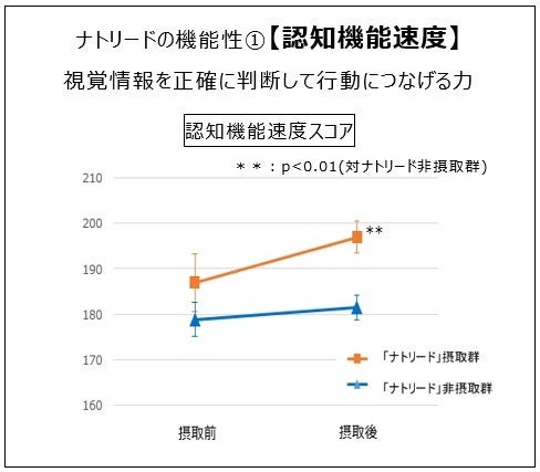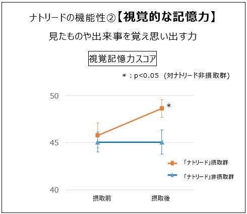 届出表示:本品にはナトリードが含まれます。ナトリードには、人の顔や物を置いた場所、戸締りをしたことを覚えておくなど、中高年の方の認知機能の一部である視覚的な記憶力を維持するのに役立つ機能が報告されています。※視覚的な記憶力とは、図形を認識し、記憶し、それを後から呼び起こす力であり、図形や空間的表現の処理能力のことをいいます。また、中高年の方の認知機能の一部である認知機能速度(視覚情報を素早く正確に判断して適切な行動につなげる力)を維持するのに役立つ機能が報告されています。
