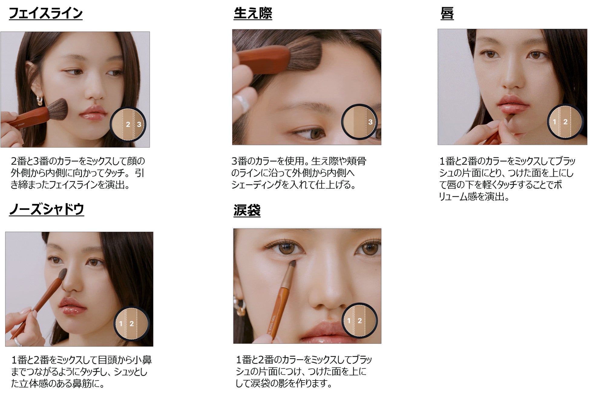 自然なグラデーションでフェイスラインをすっきり見せることはもちろん、生え際に入れたり、ノーズラインや唇に立体感を演出したり、涙袋の影を作るなど、幅広い用途でご活用いただけます。