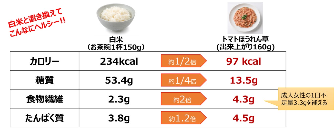 【トマトほうれん草】エネルギー 97kcal、たんぱく質 4.5g、脂質 1.8g、炭水化物 17.8g (糖質 13.5g、食物繊維 4.3g)、食塩相当量 1.0g 【きのこクリーム】エネルギー 103kcal、たんぱく質 3.9g、脂質 2.3g、炭水化物 18.6g (糖質 14.5g、食物繊維 4.1g)、食塩相当量 1.0g |